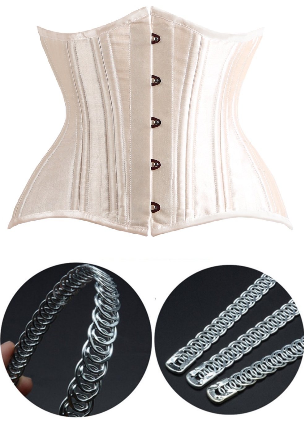 Корсет выполнен из ткани, которая практически не растягивается. В основе каркаса идут стальные косточки, которые создают силуэт и помогают сильно утянуть зону талии. Спереди стальная застежка бюск, сзади шнуровка.