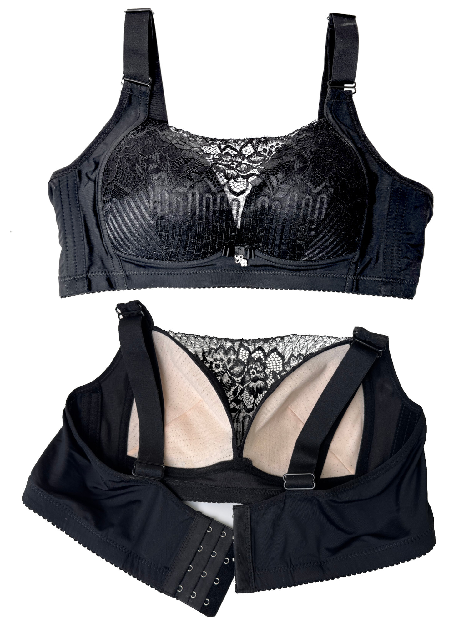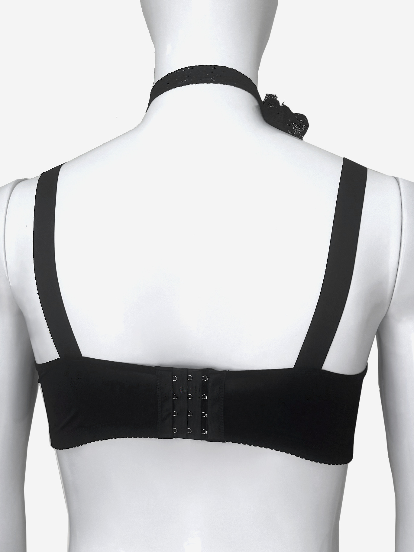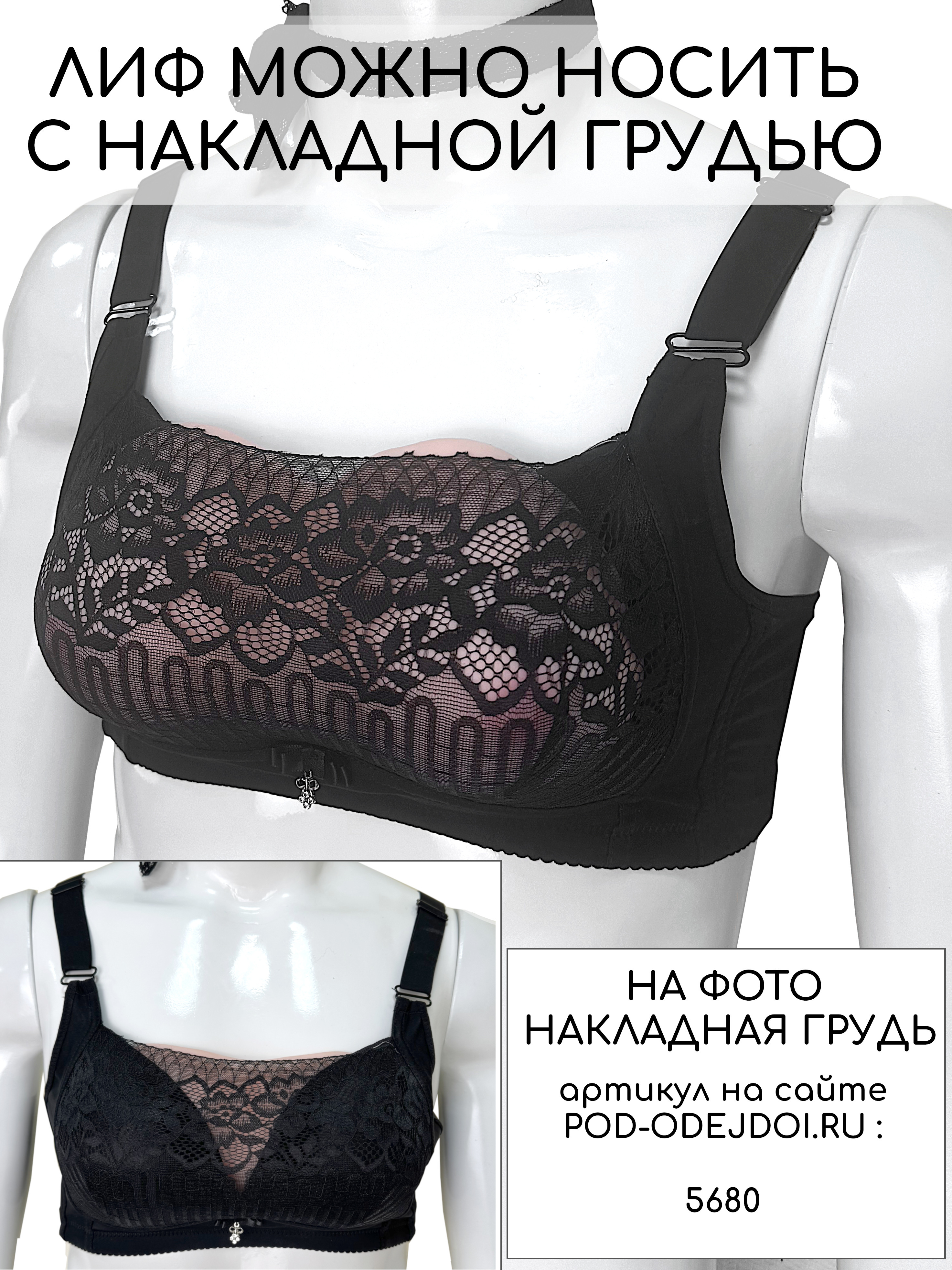 Бюстгальтер состоит из поролоновых чашечек и кружева поверх них. Как в сами чашки, так и в образующийся карман, можно вложить силиконовые протезы.