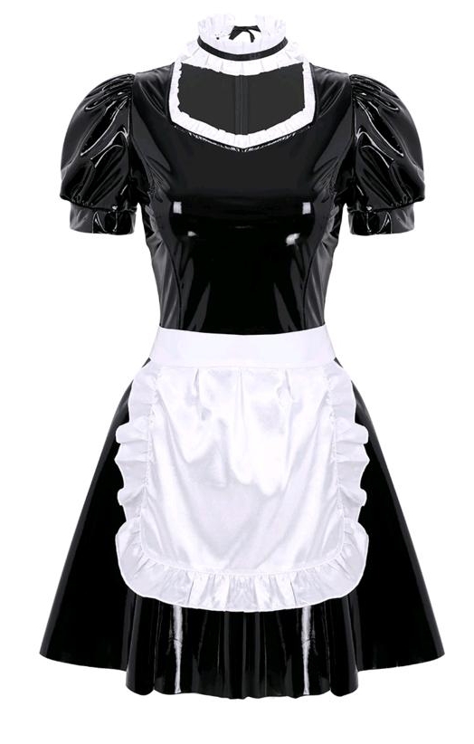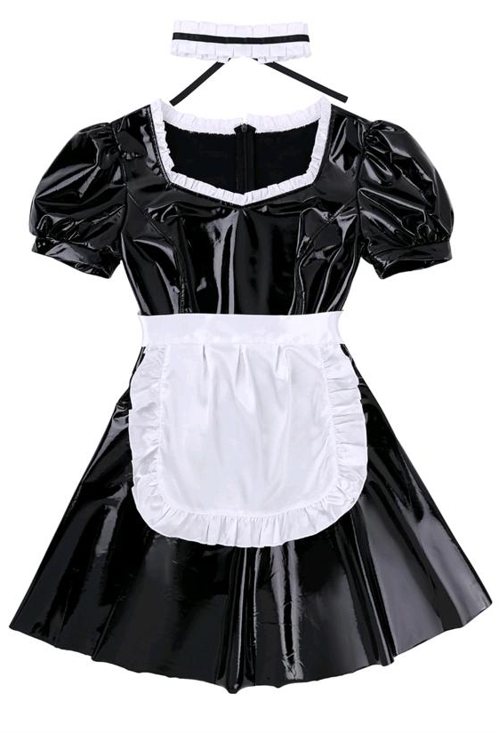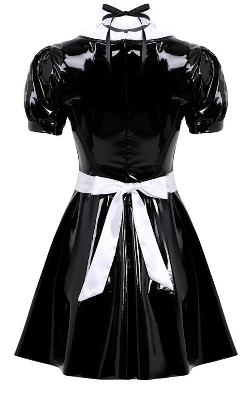 Костюм выполнен из материала, имитирующего винил. Сзади платье застегивается на молнию. Воротник платья отделан белыми рюшами.