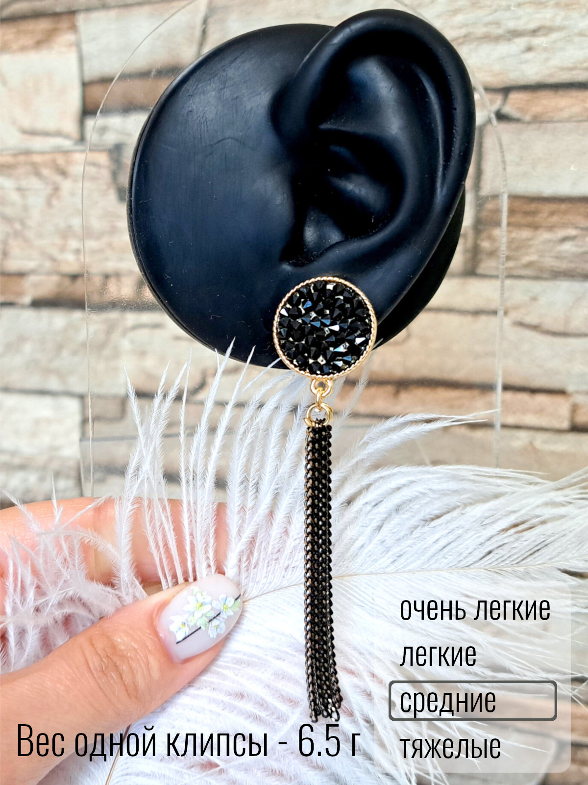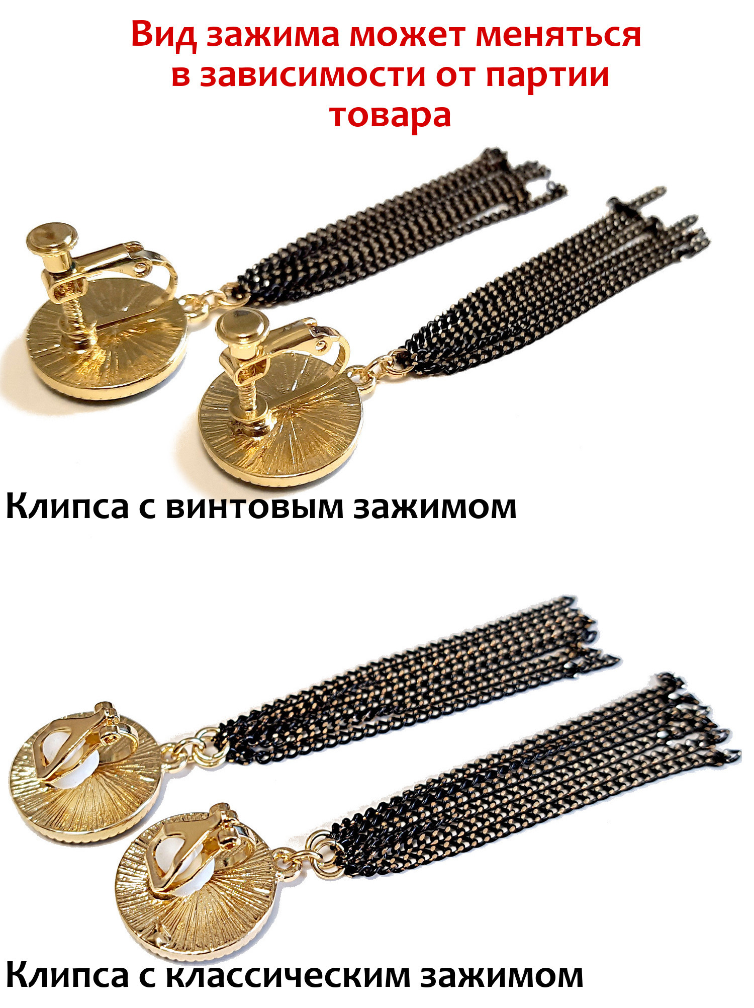 На фотографиях представлены два вида зажима для крепления клип. Оба вида зажимов подходят для непроколотых ушей.