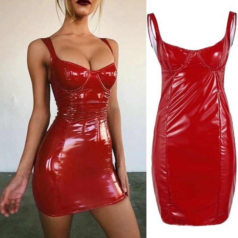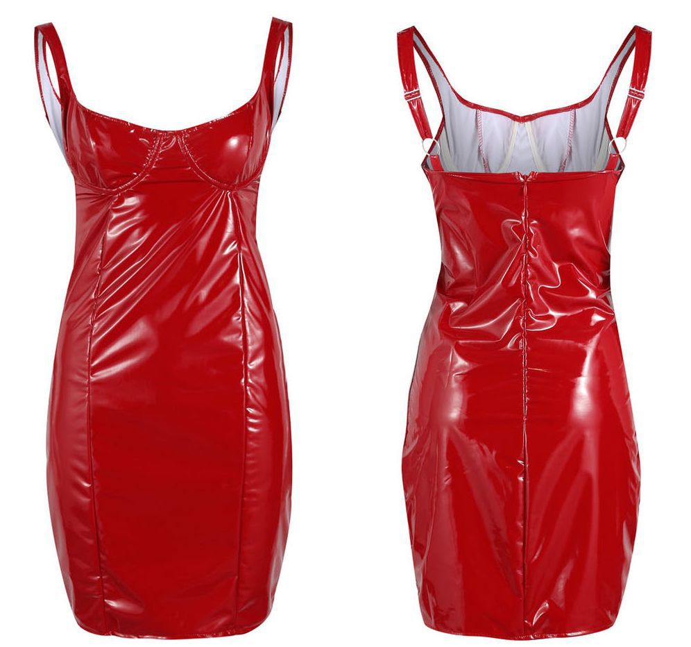 Платье выполнено из глянцевого винила.