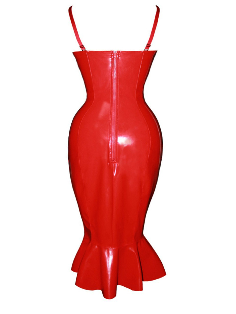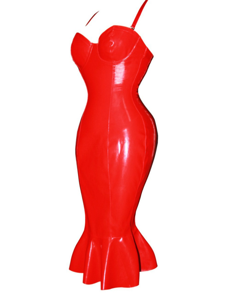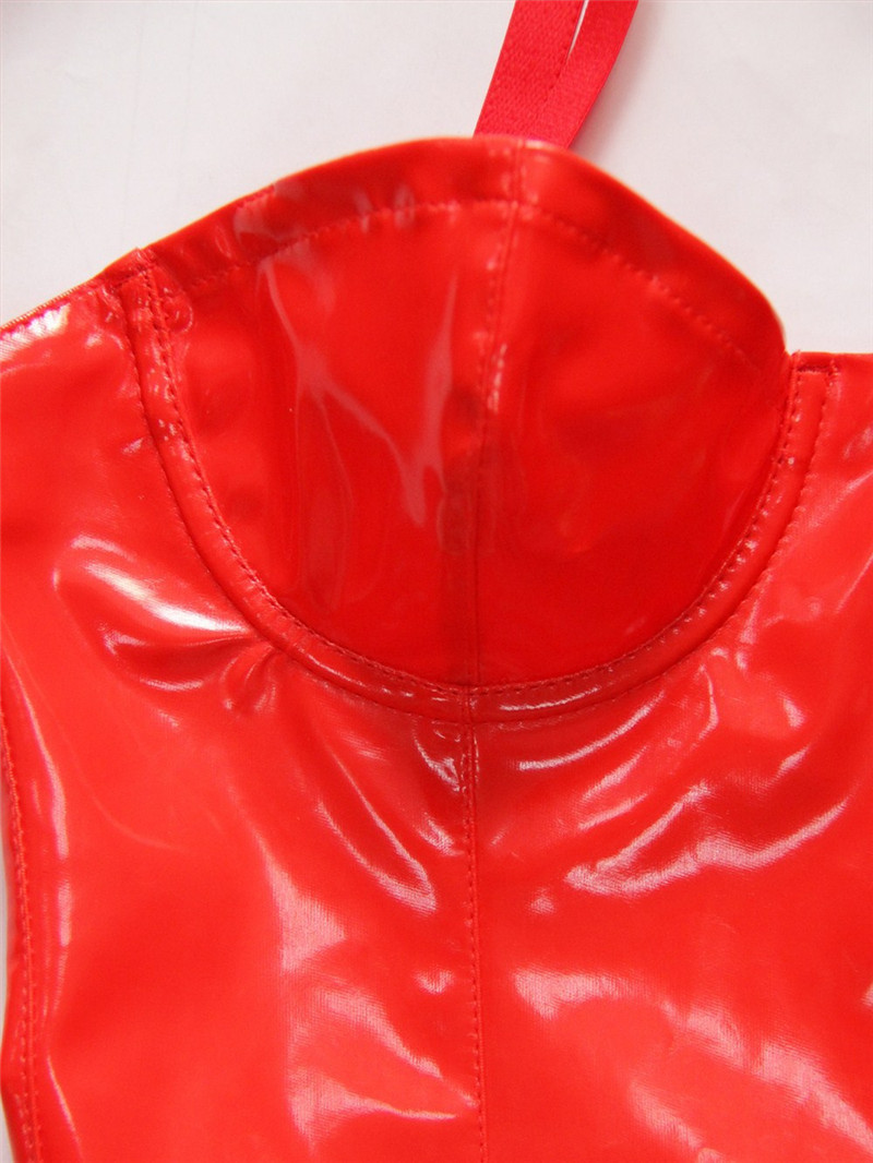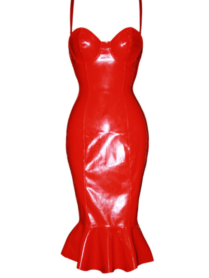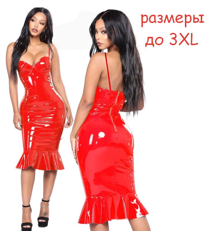 Платье выполнено из глянцевого винила.