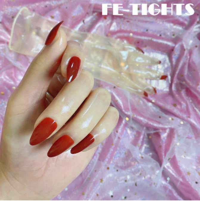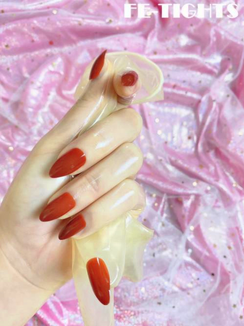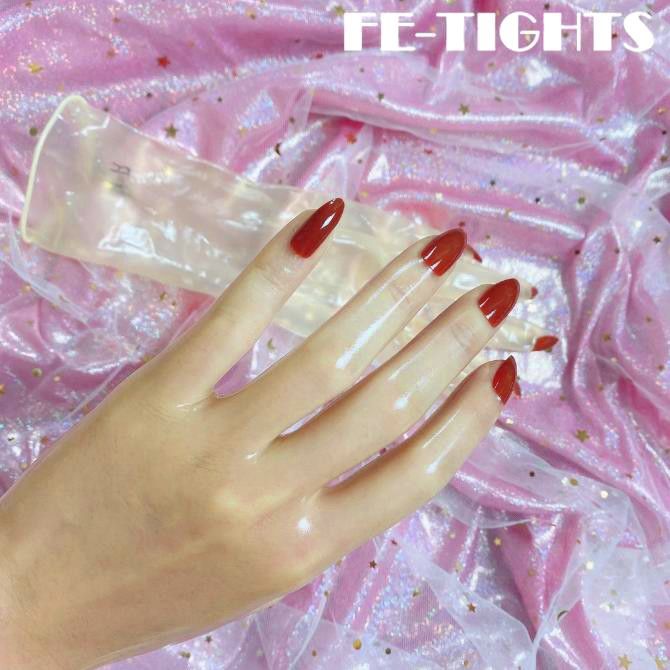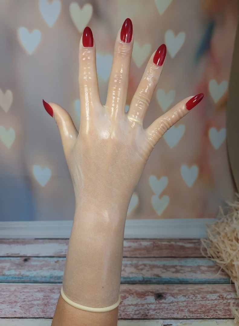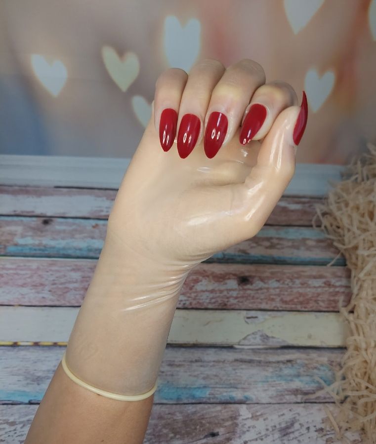 Тонкие полупрозрачные латексные перчатки с красными пластиковыми ногтями придадут рукам более гладкий и женственный вид.