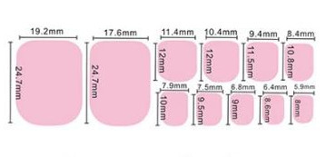 В комплекте наклейки разного размера, что позволит подобрать на каждый палец подходящий стиккер. Размеры наклеек см. на фото ниже.