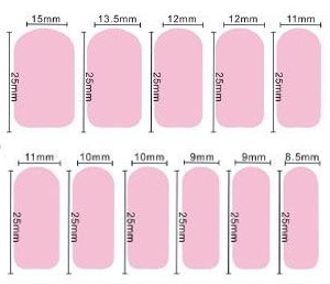В комплекте наклейки разного размера, что позволит подобрать на каждый палец подходящий стиккер. Размеры наклеек см. на фото ниже.