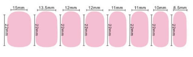 В комплекте наклейки разного размера, что позволит подобрать на каждый палец подходящий стиккер. Размеры наклеек см. на фото ниже.