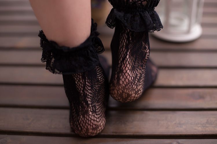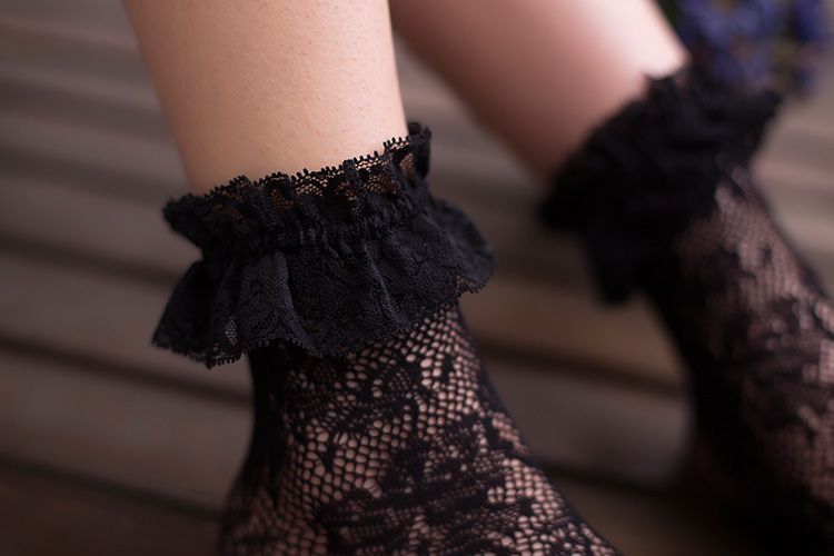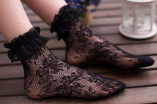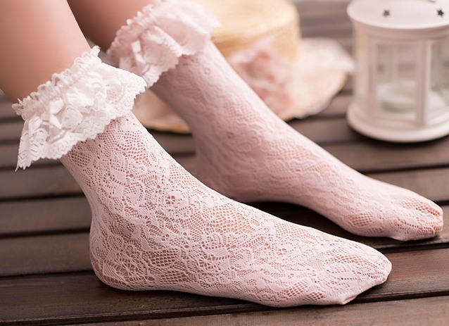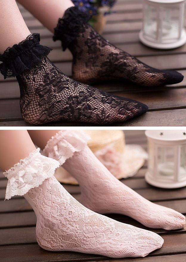 Носочки выполнены в технике чулочной вязки с цветочным узором. Верхний край украшен мягким кружевом.