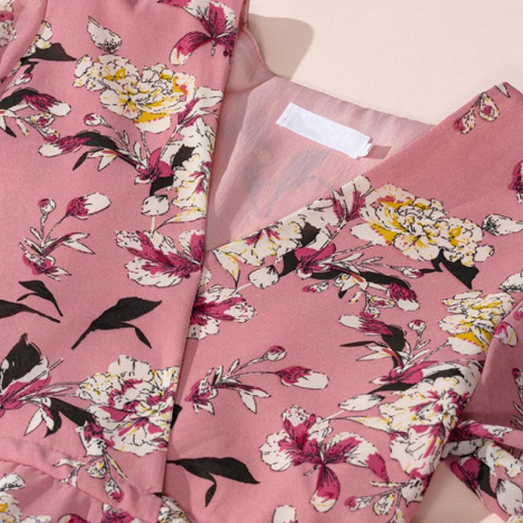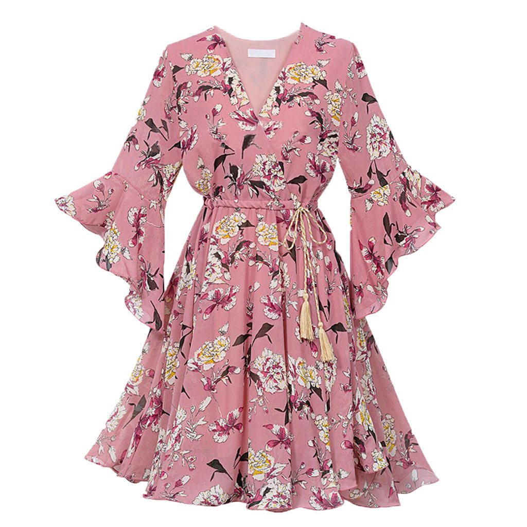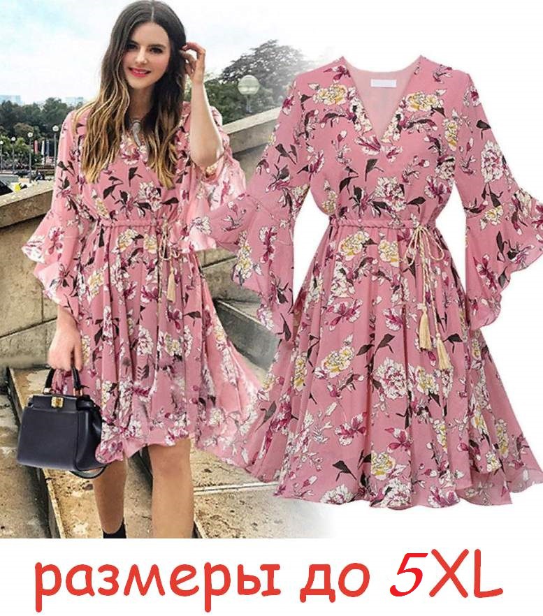 Отрезное платье с бежевой тесьмой на поясе, принт - цветы.