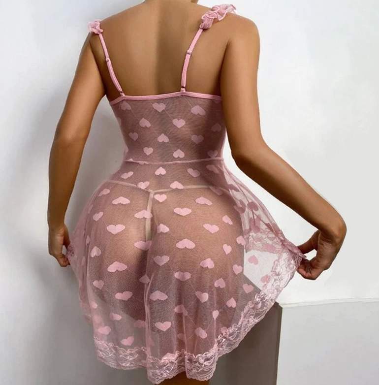 Сорочка выполнена из приятной к телу прозрачной микросетки с принтом в виде сердечек. Нижний край сорочки отделан кружевом в цвет. Длина бретелей регулируется.