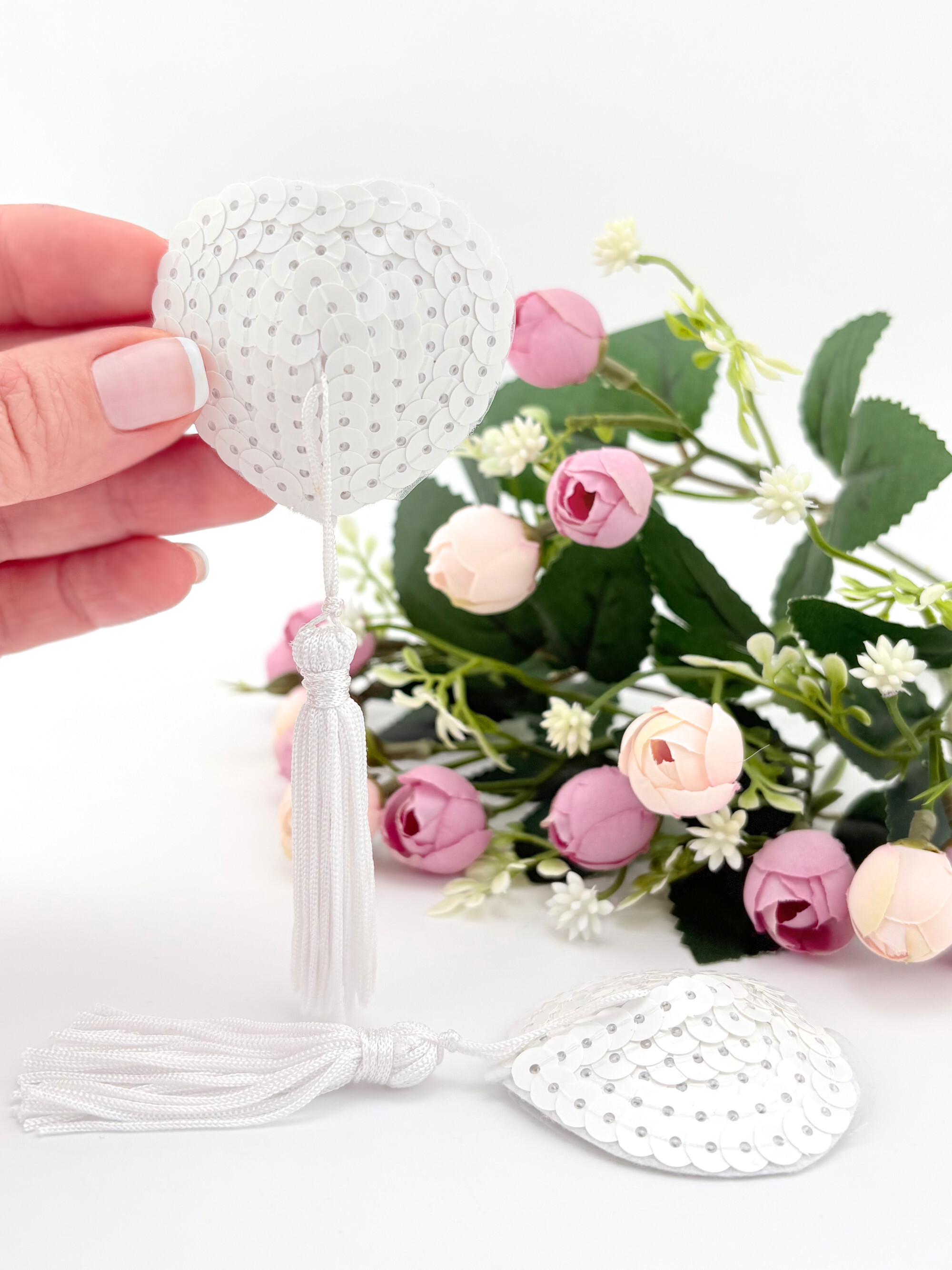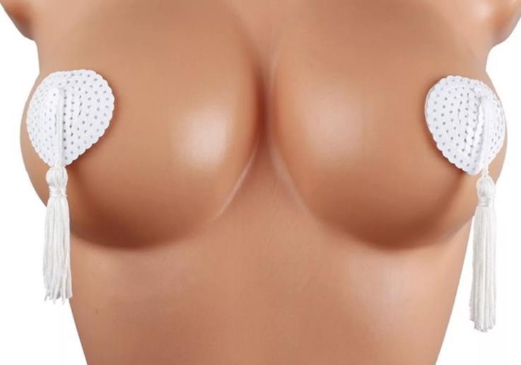Очаровательные пэстис с кисточками будут игриво смотреться на груди. Пэстис расшиты белыми пайетками.