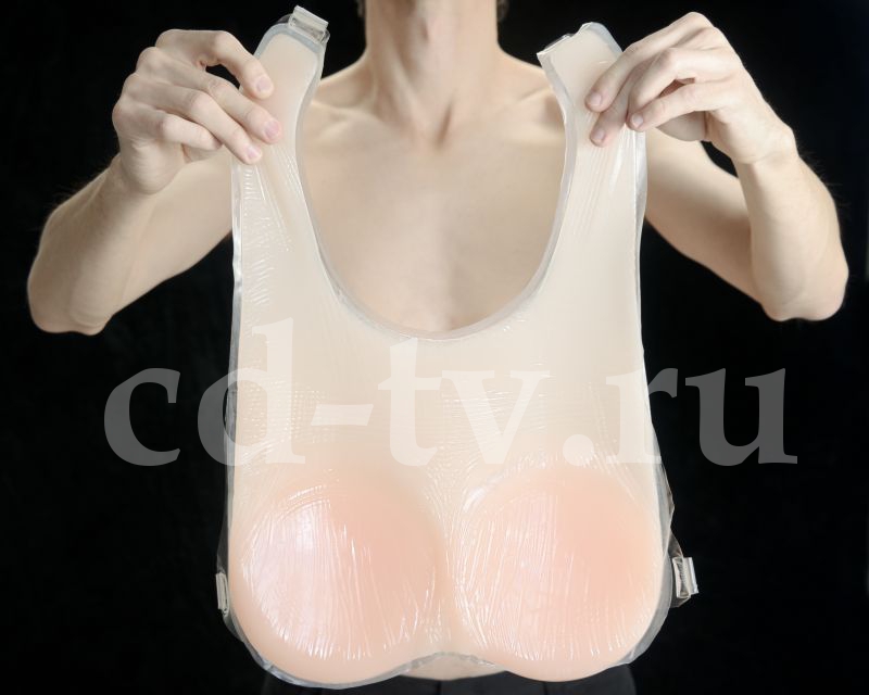 Грудь и прилегающая к ней основа изготовлены из медицинского силикона. Накладка фиксируется на теле прозрачными бретелями (на плечах и спине).