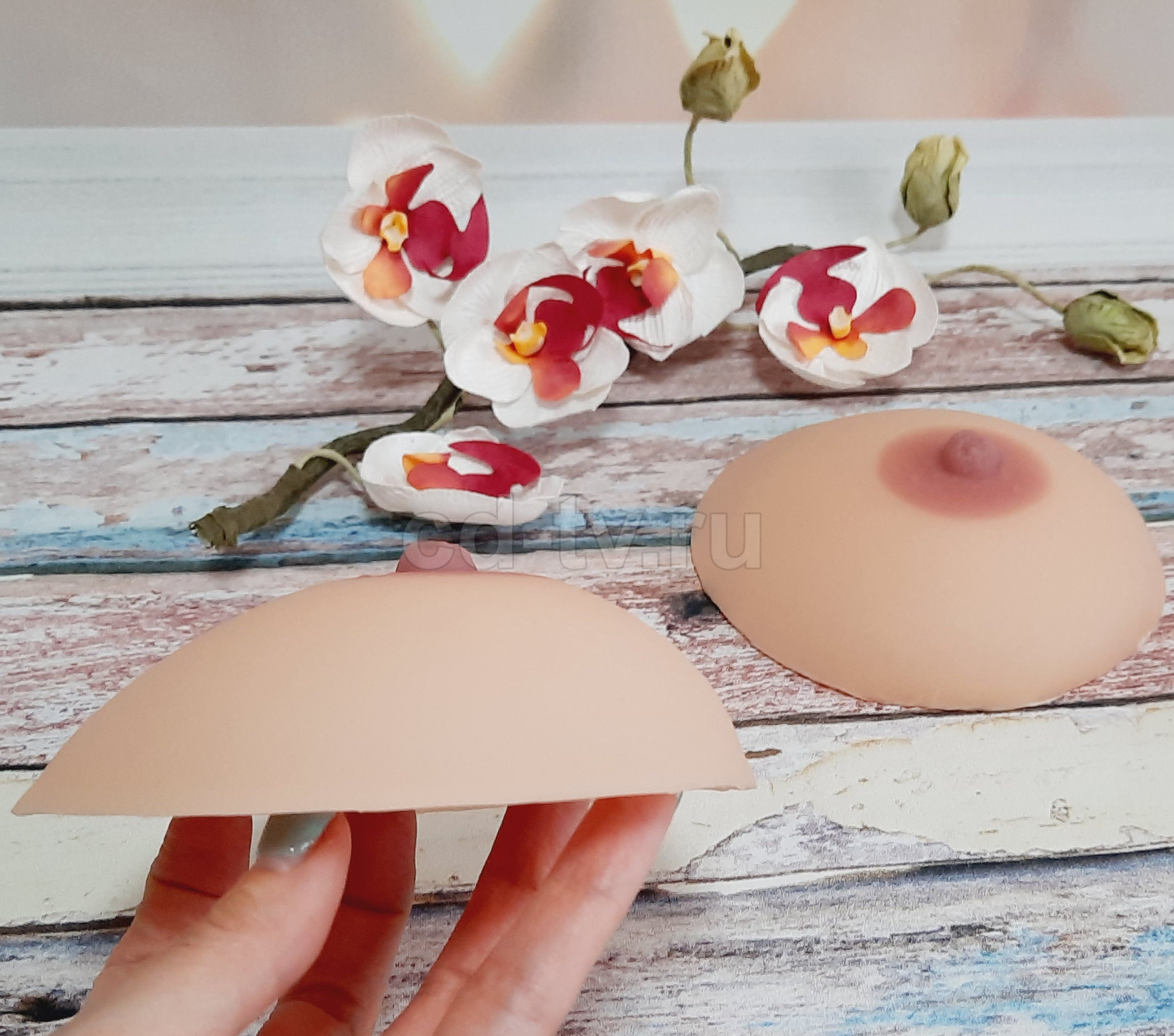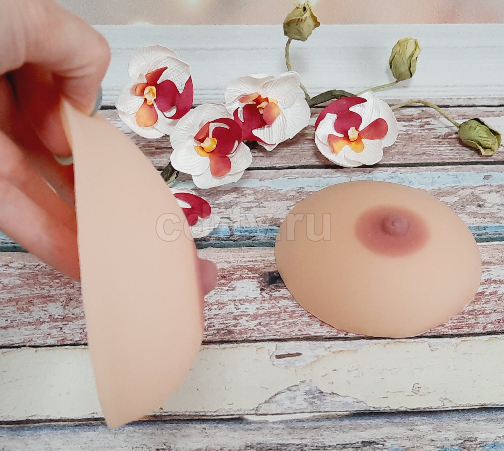 Накладную грудь весом до 1600 гр/пара можно использовать только с клеем. Более тяжелую грудь необходимо дополнительно поддерживать бюстгальтером.