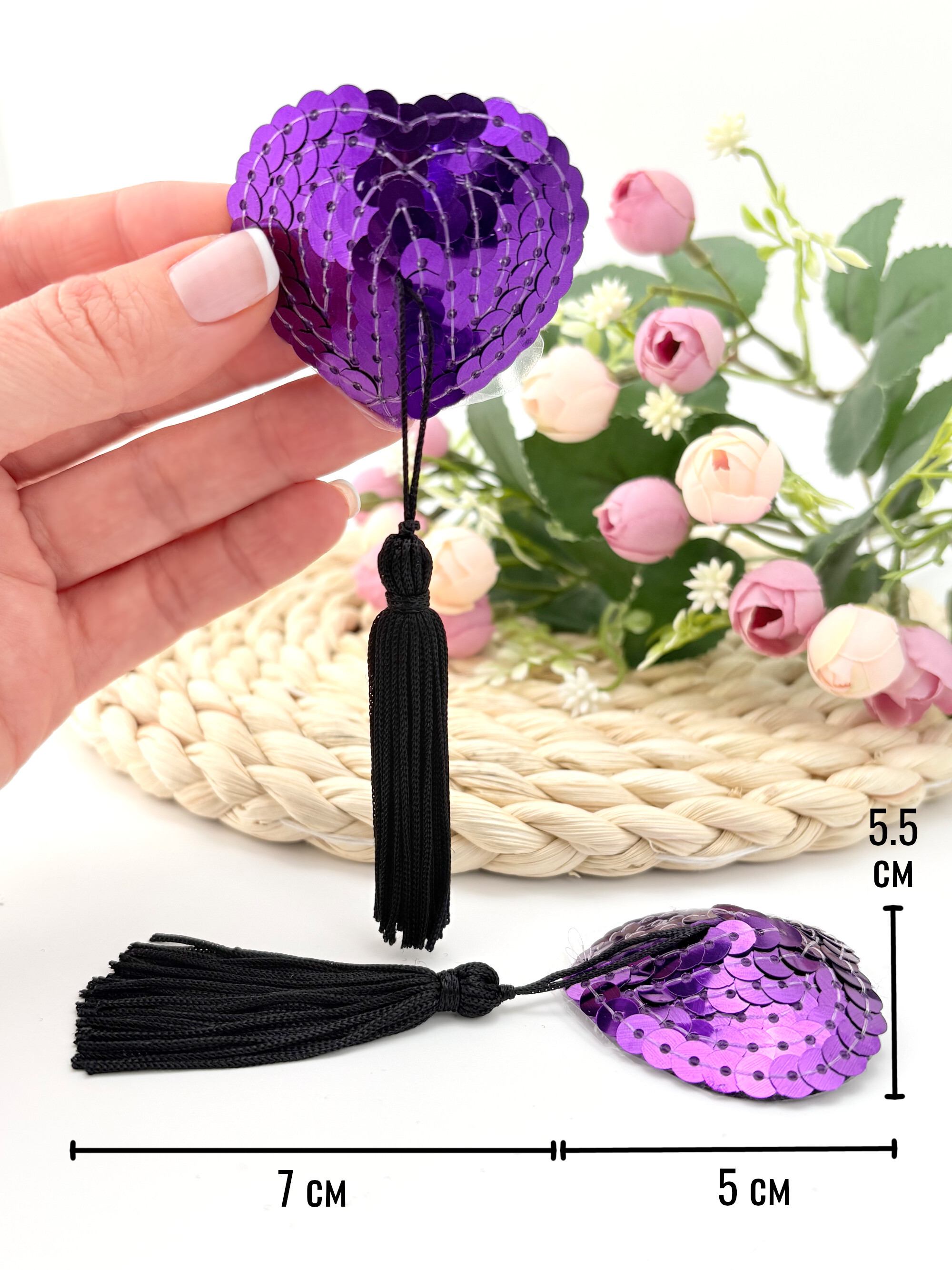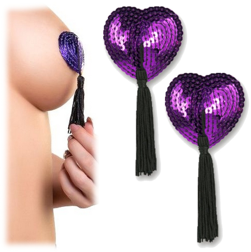 Гламурные наклейки на грудь в форме сердечек из пайеток фиолетого цвета, украшенные кистями.