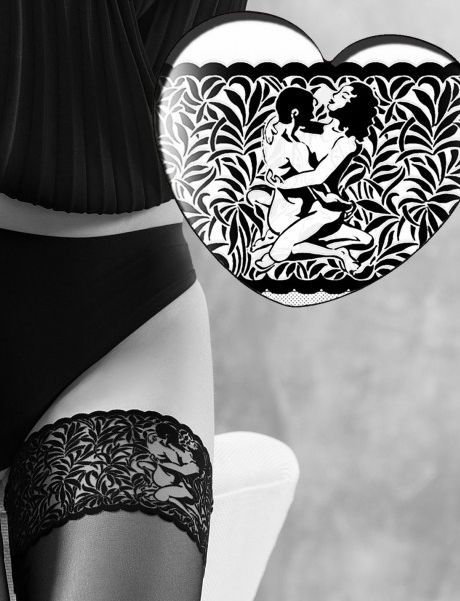 Тонкие эротические чулки с бархатистой резинкой, в узоре которой изображены "любовные утехи". Есть силиконовые полосы на внутренней стороне резинки, которые позволяют носить чулки без пояса для чулок
