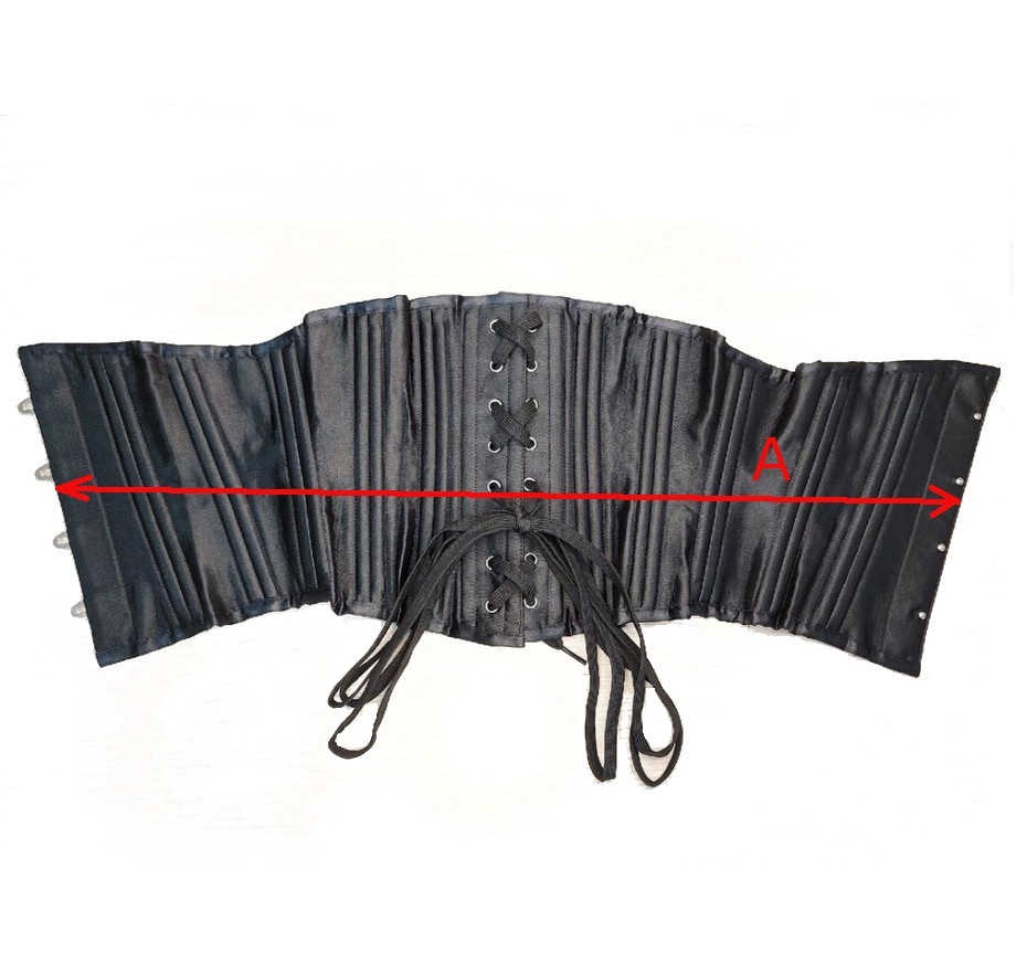 Корсет выполнен из ткани, которая практически не растягивается. В основе каркаса идут стальные косточки, которые создают силуэт и помогают сильно утянуть зону талии. Спереди стальная застежка бюск, сзади шнуровка.