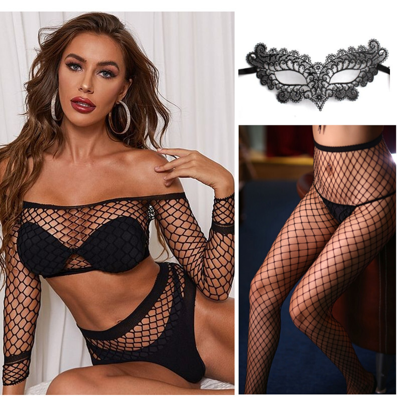 В копмлект входит топ и трусики из крупной сетки.