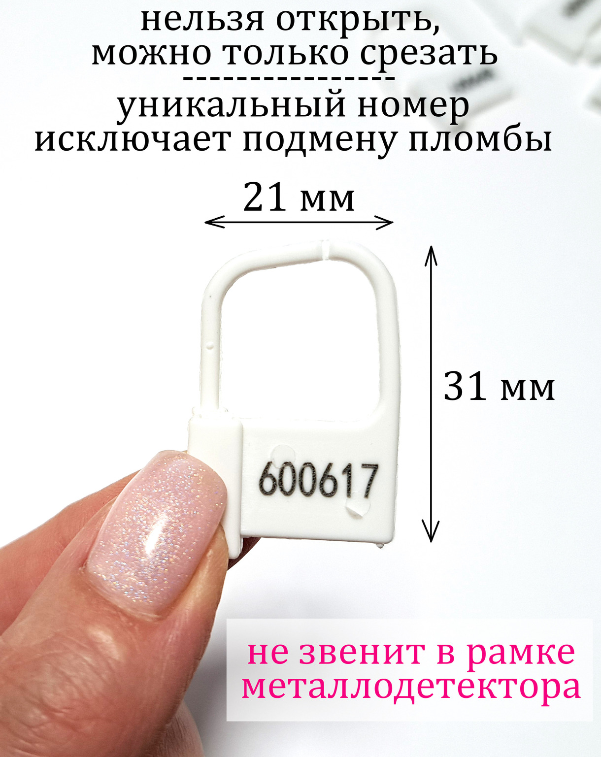 Размер пломбы 21*31 мм, ширина дужки 4 мм, толщина дужки 1,5 мм.