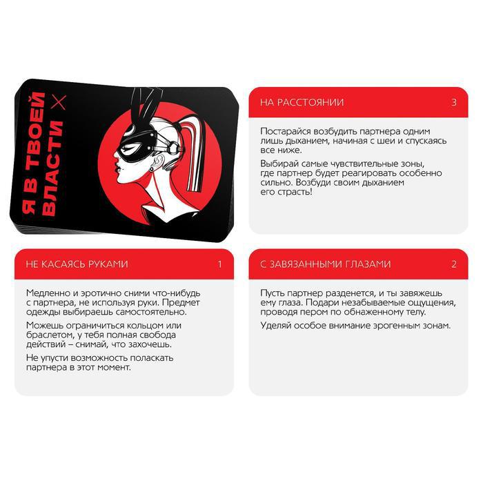 Любите экспериментировать? Эта игра обострит ваши чувства и накалит градус возбуждения между вами. Вытягивайте карты из колоды в любом порядке и выполняйте написанное, не забывая об ограничениях в каждом задании. Поддайтесь власти игры, и новые впечатления захлестнут вас.