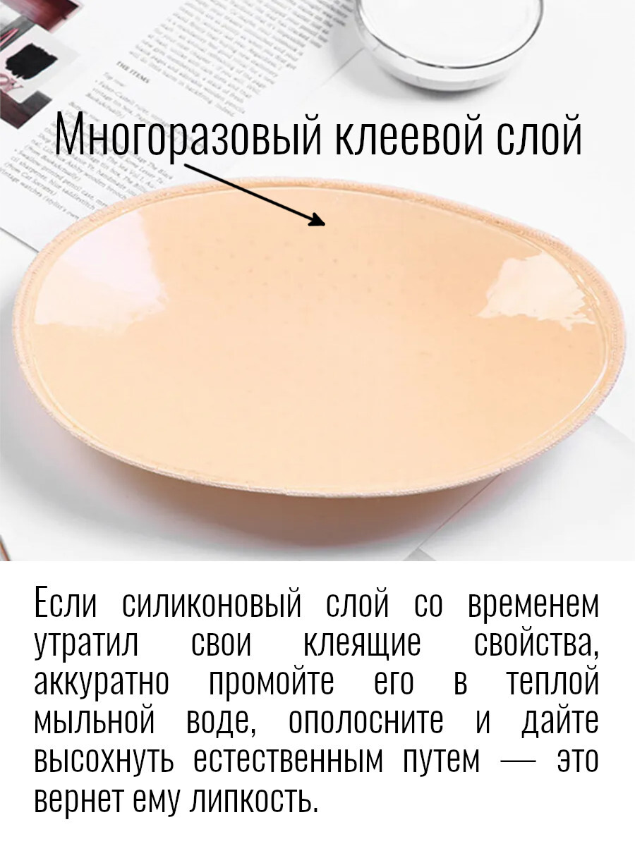 На внутренней поверхности накладки имеют многоразовый клеевой слой, который позволяет зафиксировать накладки на теле и препятствует их смещению под одеждой.
